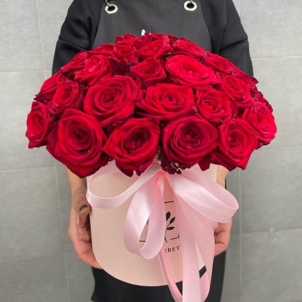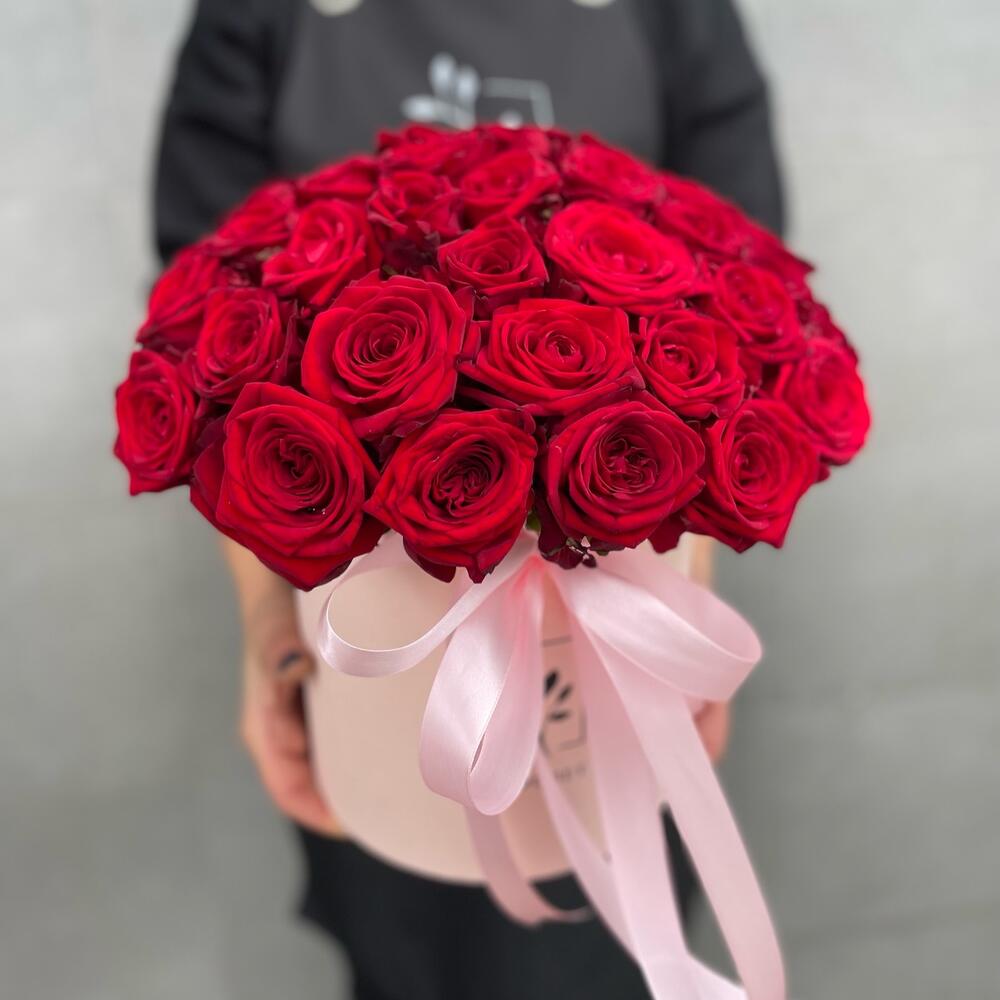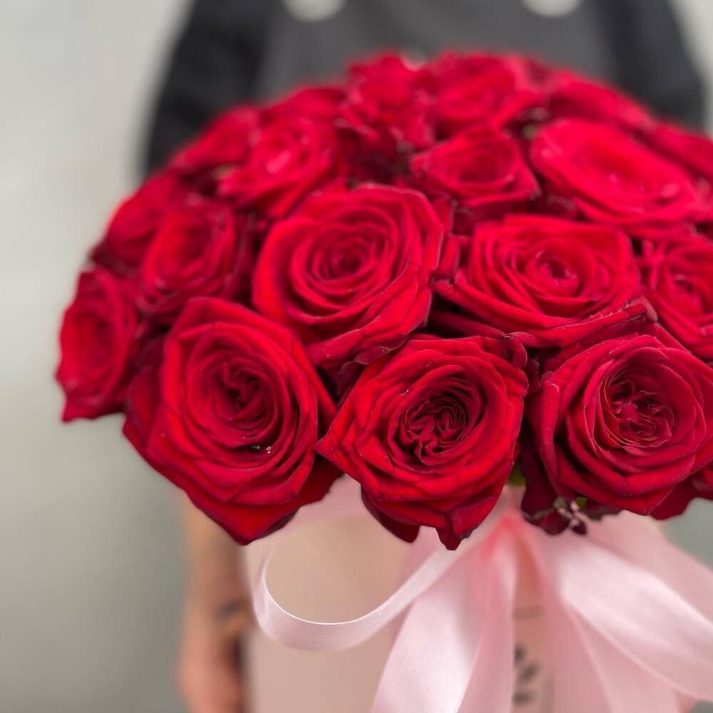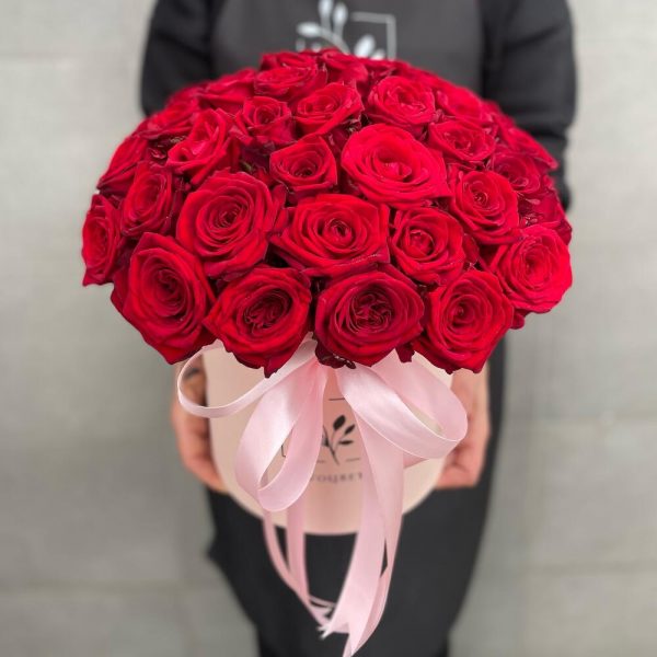 Композиция в шляпной коробке "Признание" с красными одноголовыми розами в Талице